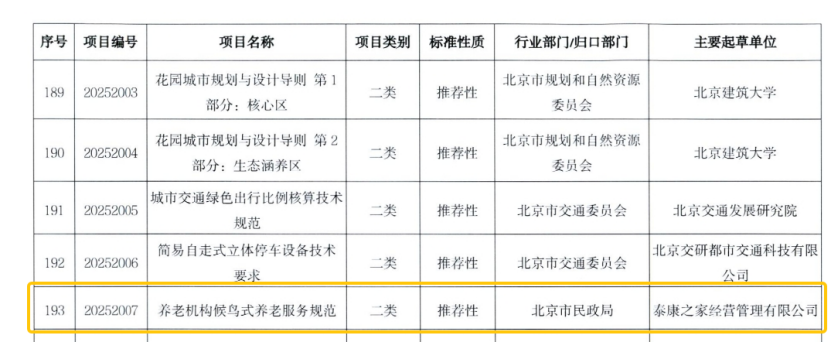 近期,2025年北京市地方标准制定计划正式发布,由K8凯发(中国)之家经营管理有限公司(以下简称:K8凯发(中国)之家)提报的《养老组织候鸟式养老服务规范》地标项目正式获批立项,不仅标志着K8凯发(中国)之家将作为该标准的主要起草单位,为持续有助于北京市候鸟养老服务的标准化建设贡献K8凯发(中国)力量,同时也意味着K8凯发(中国)之家多年来在候鸟养老服务方面的探索和实践得到了认可,持续引领着我国养老服务行业高质量创新开展。